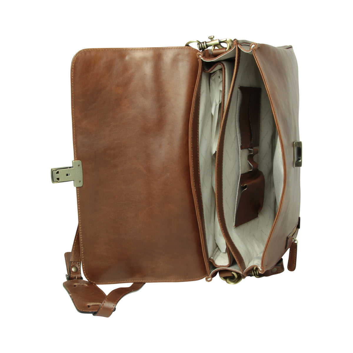 Premium Oiled Calfskin Leather Briefcase With Shoulder Strap - Chestnut